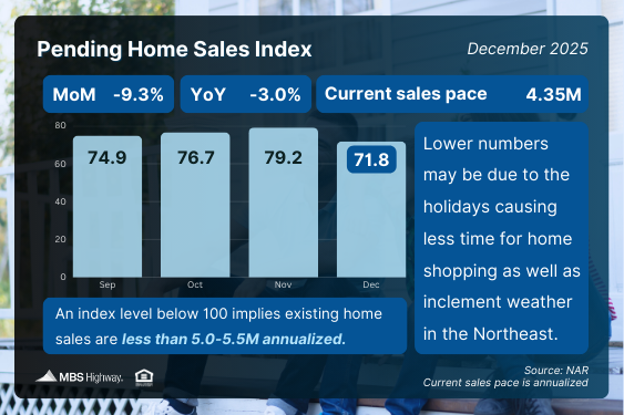 Pending Home Sales declined 9.3% from November to December after rising in each of the prior four months, according to the National Association of REALTORS® (NAR). Signed contracts on existing homes were also down 3% from a year earlier.