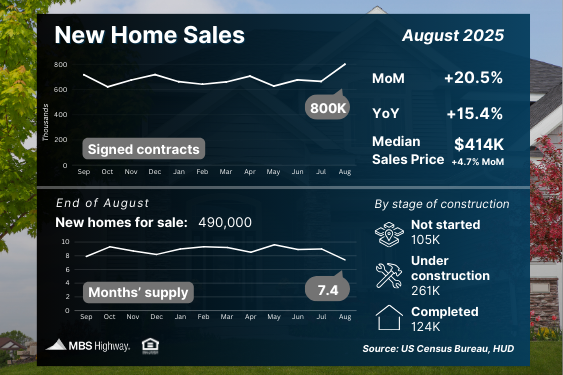 New home sales jumped nearly 21% month-over-month in August, reaching an annualized pace of 800,000 units – the fastest rate since early 2022 and well above economists’ expectations. The data reflects contracts signed during August, when rates had already started trending lower from July, though still ahead of the larger declines seen in September.